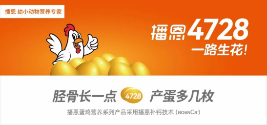 播恩4728,一路生花。為解決蛋雞養(yǎng)殖的營養(yǎng)痛點(diǎn),提供更專業(yè)細(xì)致的飼料營養(yǎng)呵護(hù),播恩對產(chǎn)品創(chuàng)新迭代升級,并全新推出4728蛋雞營養(yǎng)系列新品。該系列產(chǎn)品均采用播恩補(bǔ)鈣技術(shù),完美解決鈣消化、鈣吸收和鈣沉積三大命題,已申請專利保護(hù)。新品覆蓋了蛋雞育雛、育成、產(chǎn)蛋和淘雞4個時期的7個核心營養(yǎng)產(chǎn)品:開口料H000、育雛料H041、育成料H042、產(chǎn)蛋料H353/H033,伴產(chǎn)寶、伴殼寶、伴淘寶。具有更強(qiáng)的產(chǎn)品力及競爭優(yōu)勢,有效滿足專業(yè)化蛋雞養(yǎng)殖營養(yǎng)需求。