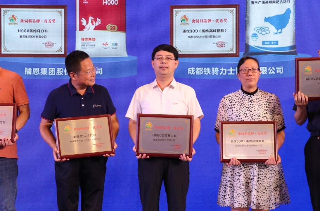 禽營養(yǎng)研發(fā)部二級總監(jiān)張?jiān)鲇瘢▓D左二)代表播恩集團(tuán)領(lǐng)取