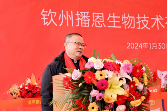 欽北區(qū)副區(qū)長黃如龍,廣西飼料工業(yè)協(xié)會會長、廣西大學(xué)教授沈水寶博士,播恩集團廣西特區(qū)總經(jīng)理曾紹鵬,欽州工廠總經(jīng)理楊春,分別做了致辭。