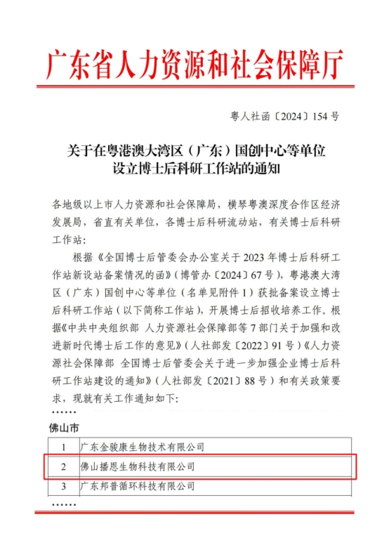 近日,廣東省人力資源和社會保障局印發(fā)了《關于在粵港澳大灣區(qū)(廣東)國創(chuàng)中心等單位設立博士后科研工作站的通知》粵人社函〔2024〕154號,佛山播恩生物科技有限公司成功獲批設立國家級博士后科研工作站。這一榮譽標志著佛山播恩在高層次人才培養(yǎng)、科研創(chuàng)新及產學研合作方面邁出了堅實的一步,為企業(yè)未來發(fā)展注入了強勁動力。